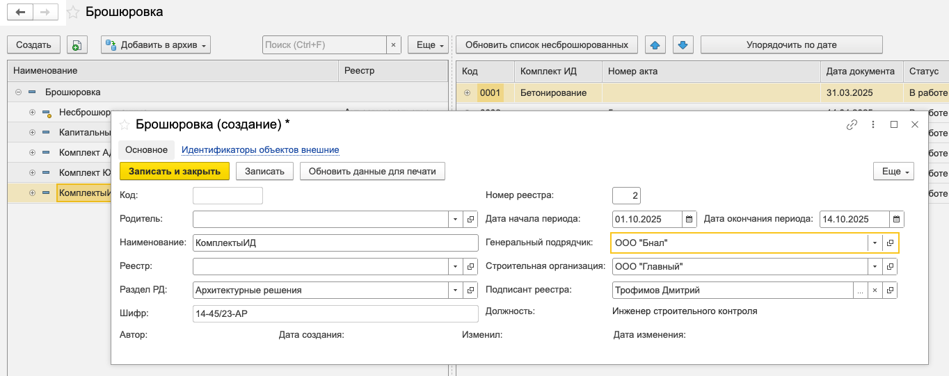 Автоматическое распределение комплектов исполнительной документации по реестрам выполняется только при включенной настройке учёта «Формирование брошюровки по объектам строительства».