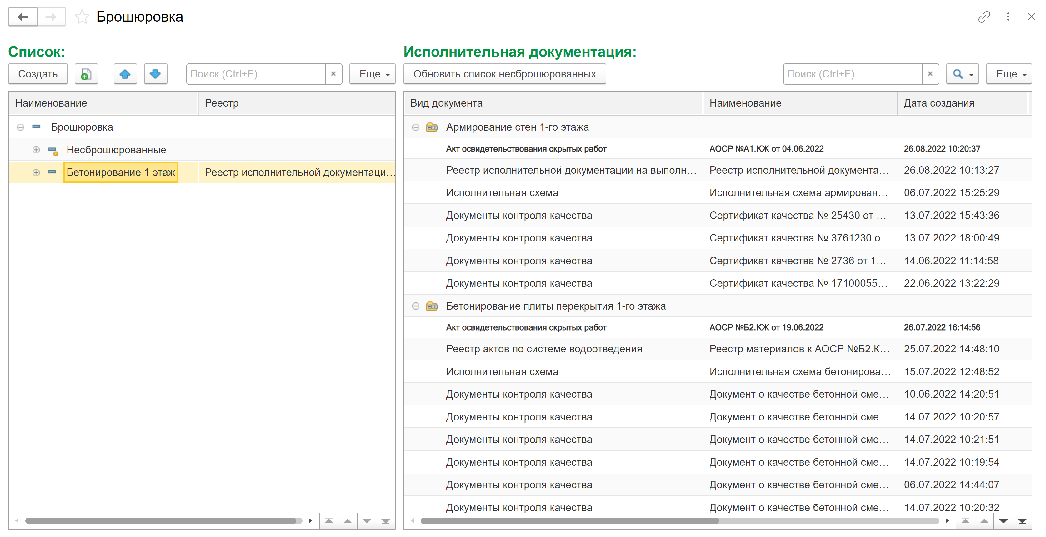 По умолчанию Комплект исполнительной документации попадает в раздел «Нераспределённые», после чего пользователь создает запись с реестром, вручную переносит нужные комплекты в него, формирует реестр, открывает запись реестра, нажимает кнопку «Обновить данные», сохраняет запись и затем выполняет брошюровку с формированием печатной формы (ПФ).