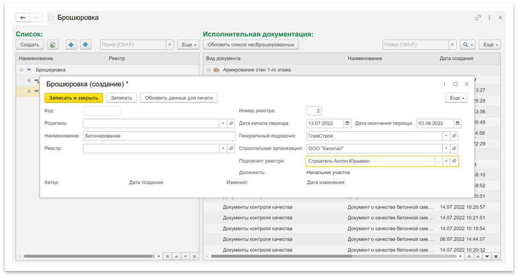 Создание брошюровки. Для этого необходимо нажать на кнопку «Создать» в списке брошюровок, в открывшейся форме (Рисунок 1) указать наименование, номер реестра, даты начала и окончания периода и представителей генподрядной и строительной организации, в дальнейшем указанные данные будут использоваться для составления реестра.