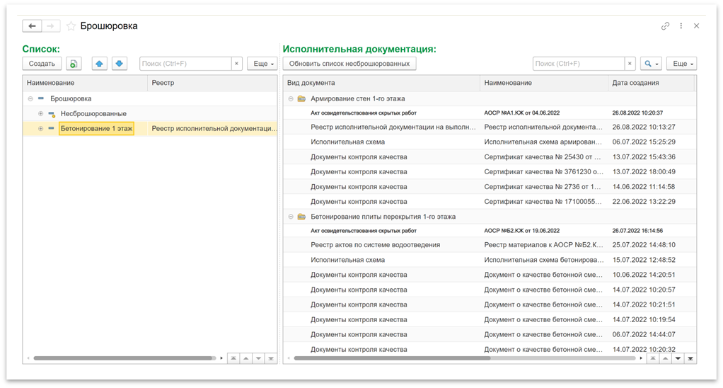 После создания брошюровки в неё переносятся комплекты ИД (Рисунок 2), на которые будет автоматически сформирован реестр с перечнем всех документов, входящих в выбранные комплекты ИД. Для создания реестра нажмите правой кнопкой мыши на брошюровку и в списке функций выберите «Сброшюровать».