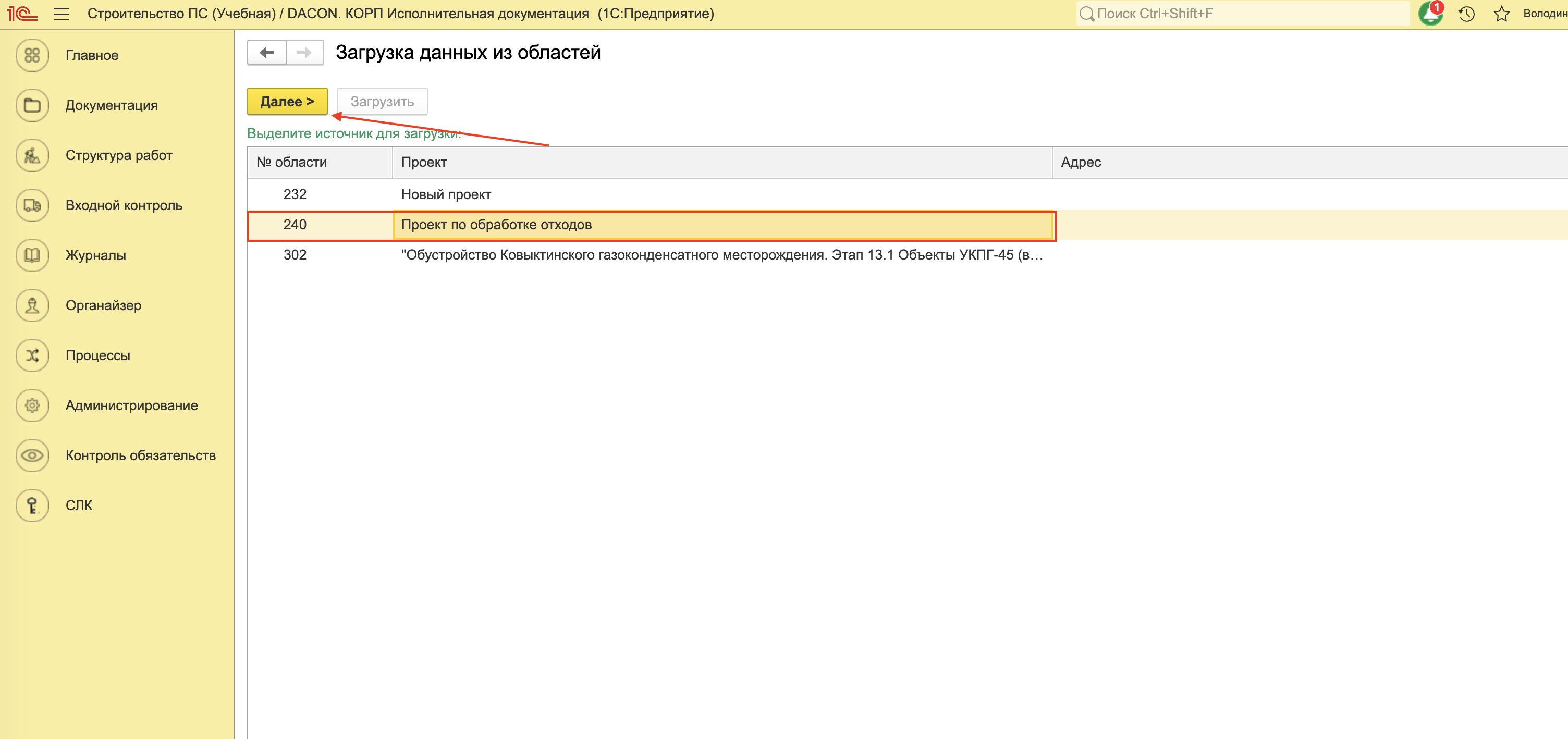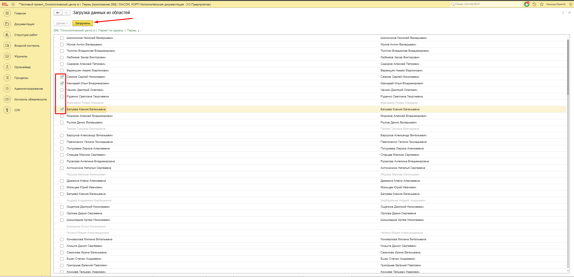 Необходимо установить флажок напротив пользователей, которых требуется перенести в другую область данных, и нажать кнопку «Загрузить».