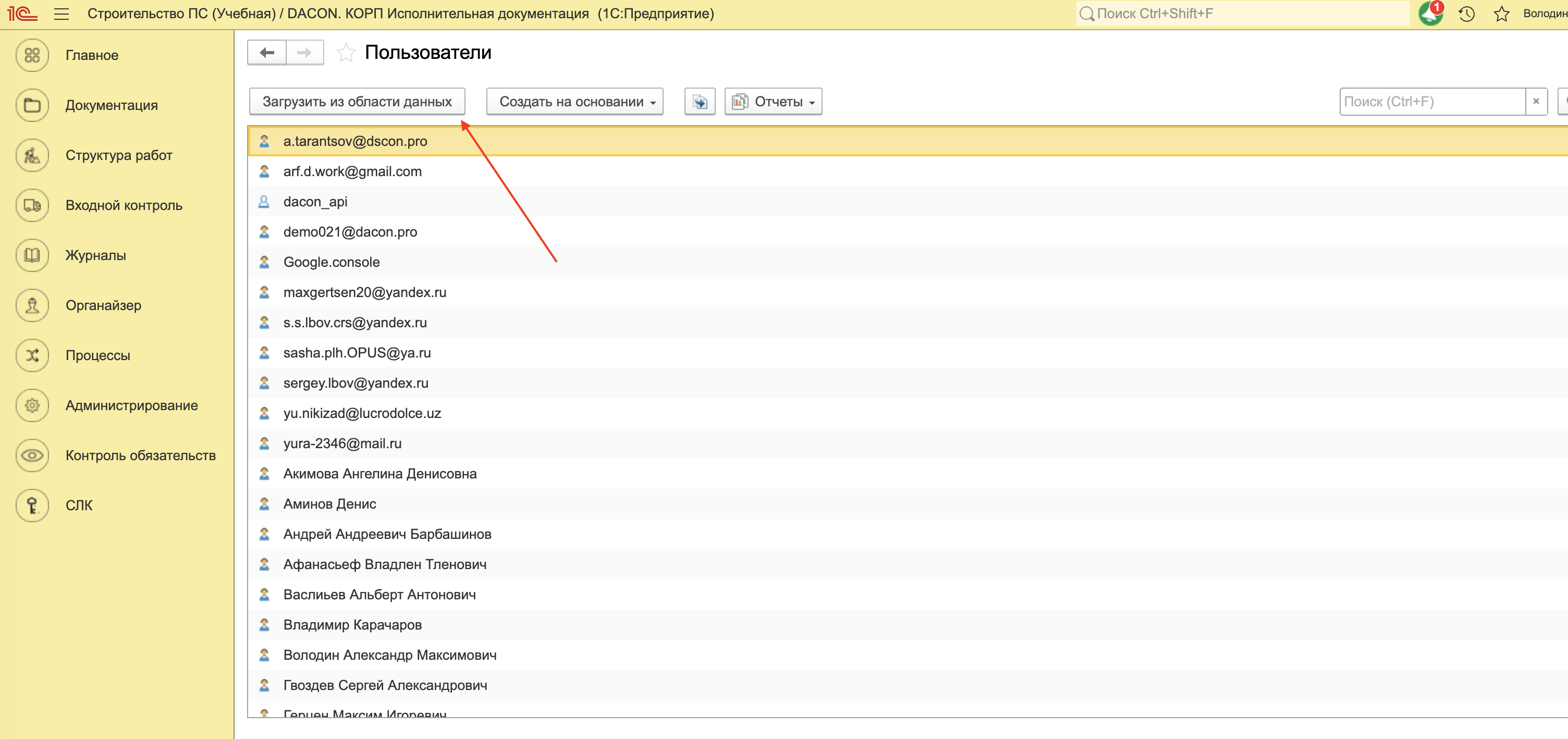 После открытия справочник «Пользователи» в верхней части формы доступна кнопка «Загрузить из области данных».