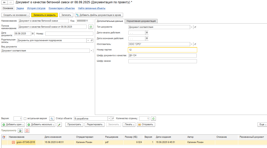 При выборе видов документа «Документ контроля качества» и «Документ соответствия» у документа добавляются дополнительные реквизиты (Рисунок 53), которые нужны для подбора материалов при выполнении работ.