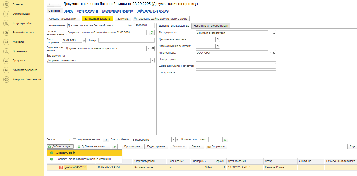 Затем нужно нажать на кнопку «Добавить один», чтобы загрузить один файл, и выбрать в выпадающем списке пункт «Добавить файл» или «Добавить файл с разбивкой на страницы». Разбивка на страницы позволяет ссылаться на конкретную страницу документа при выполнении работ и в действиях. После выбора файла необходимо заполнить информацию о нём, включая количество страниц. По умолчанию значение в поле «Количество страниц» равно 1, однако его следует скорректировать в соответствии с фактическим количеством страниц в документе.