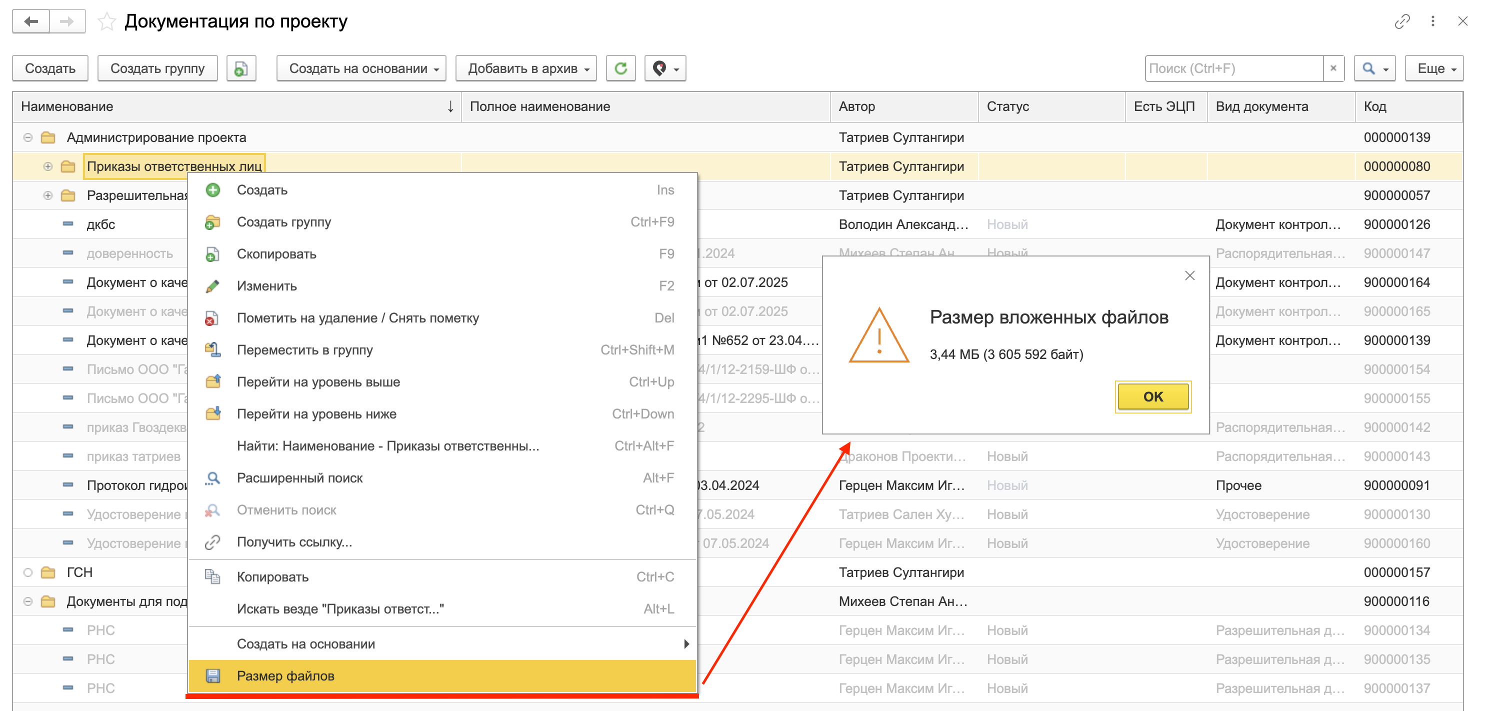 Выгрузка документации. Выгрузка документации в архив из системы DACON выполняется через справочник «Документация по проекту». Для начала необходимо открыть данный справочник и оценить размеры выгружаемых папок. Чтобы посмотреть размер папки, нажмите на неё правой кнопкой мыши и выберите пункт «Размер файлов» (Рисунок 54).