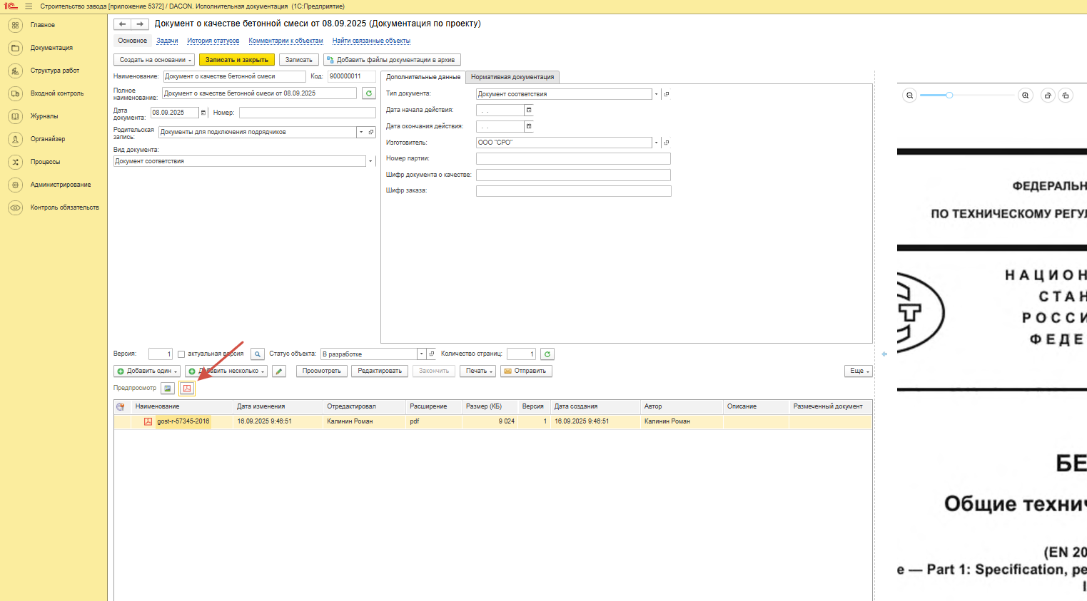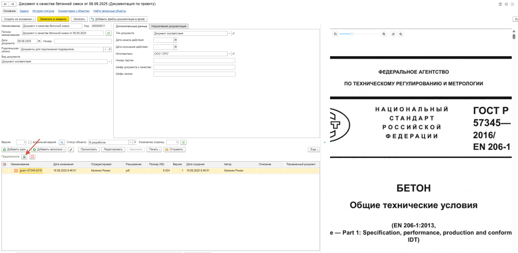 Например, для документа качества на бетон, для удобства идентификации документа в поле «Наименование» указывается текст «ДКБС на бетон В25» и далее — это текст продублируется в поле «Полное наименование», при этом лишнюю информацию о материале из поля «Полное наименование» следует удалить. (данные о материале)