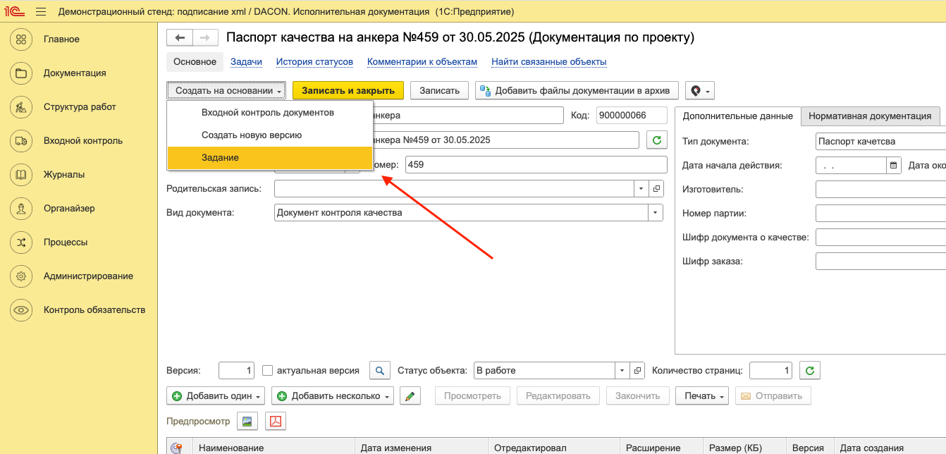 Выдача замечаний по документу. По каждому документу проекта в системе можно создать замечание. Для этого необходимо открыть документ по проекту или документ исполнительной документации, в окне просмотра документа нажать кнопку «Создать на основании» и выбрать пункт «Задание» (Рисунок 66).