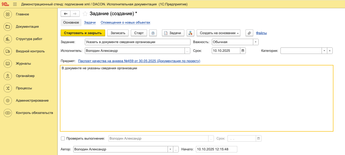 После этого необходимо нажать кнопку «Стартовать и закрыть», исполнителю поступит задание на устранение замечания по документу. Если был отмечен пункт «Проверить выполнение», указанному сотруднику поступит задание на проверку устранения замечания.