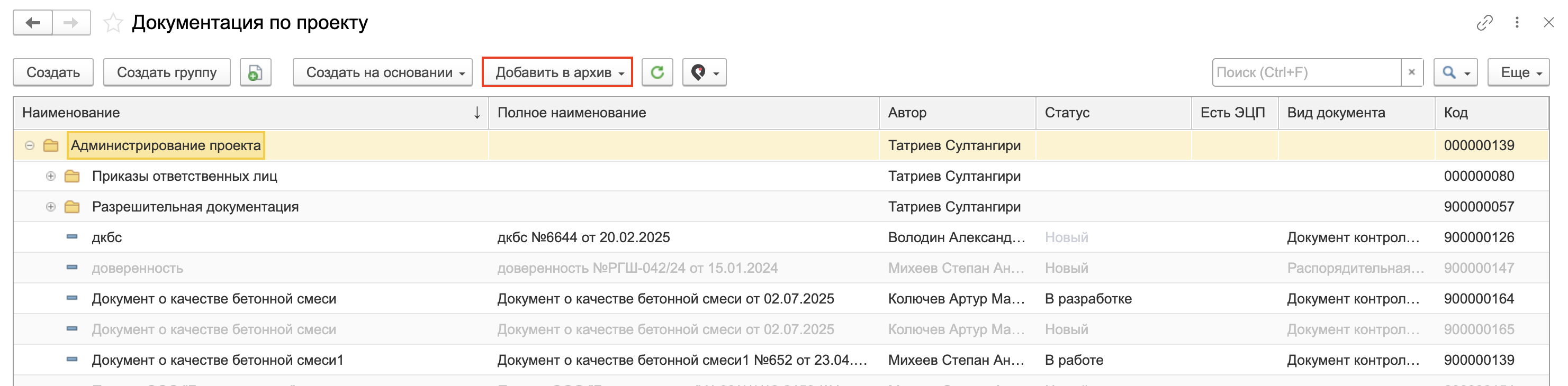 · Добавить файлы документации в архив – выгружаются все файлы без учета статусов.