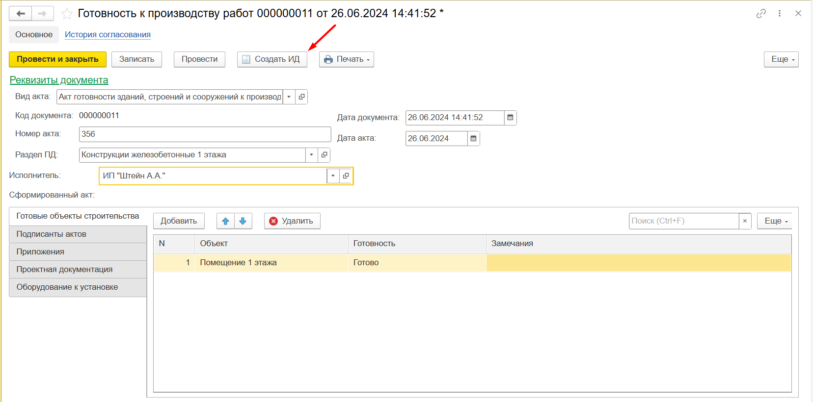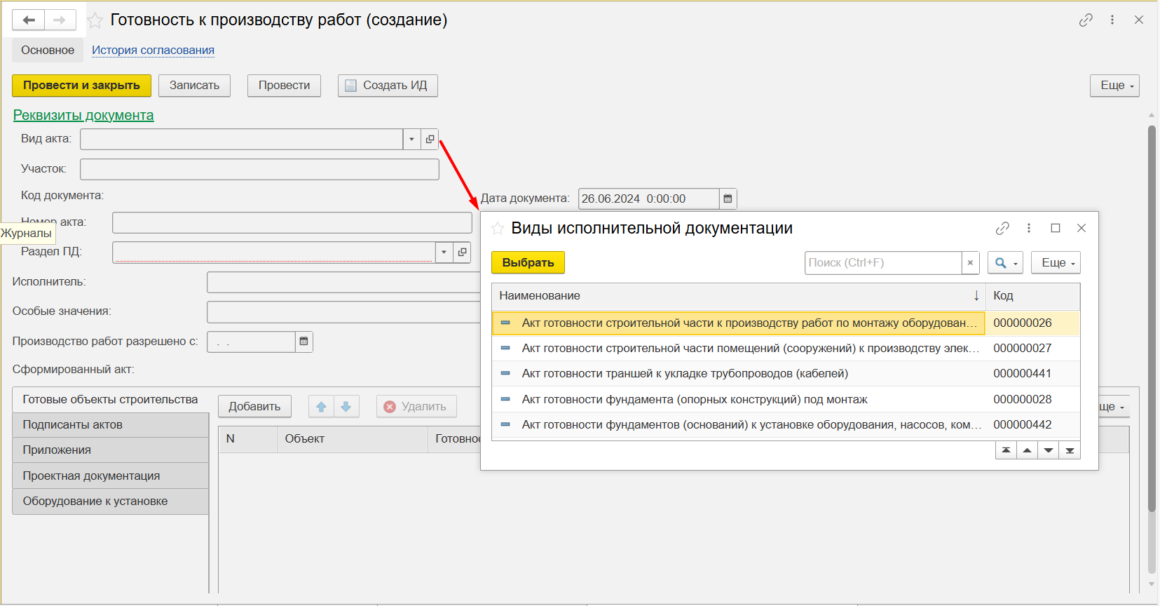 Рисунок 112 – Создание документа готовность к производству работ