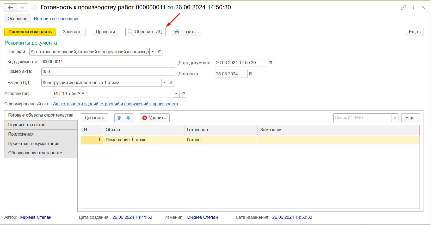 Рисунок 115 – Обновление данных документа готовность к производству работ