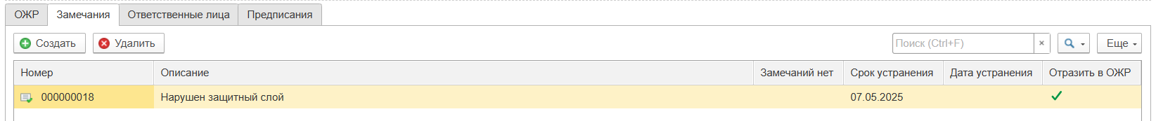 После выполнения задания ответственным пользователем и его принятия строительным контролем, в табличной части Замечания и соответствующем разделе ОЖР автоматически будет установлена дата устранения недостатков, соответствующая дате выполнения задания.