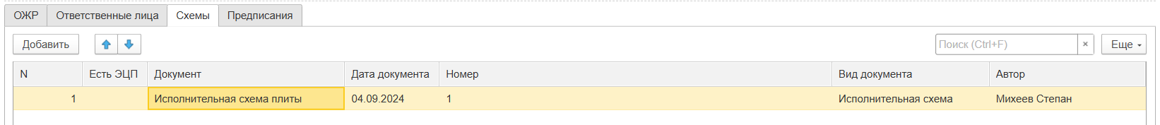 Вкладка Схемы появляется только когда Вид контроля = Геодезический. В данную вкладку геодезист может приложить исполнительную схему, сформированную по результатам геодезической съемки. Для добавления необходимо нажать на кнопку добавить и выбрать подходящую запись справочника Исполнительная документация (Рисунок 110).