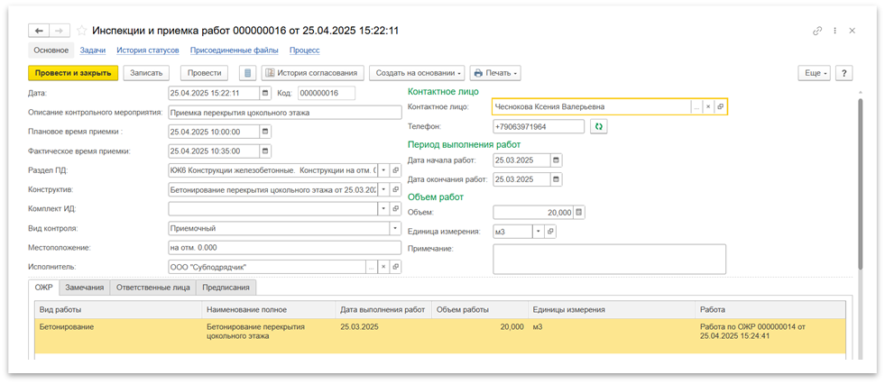 · Фактическое время приемки — фактические дата и время проведения инспекции;