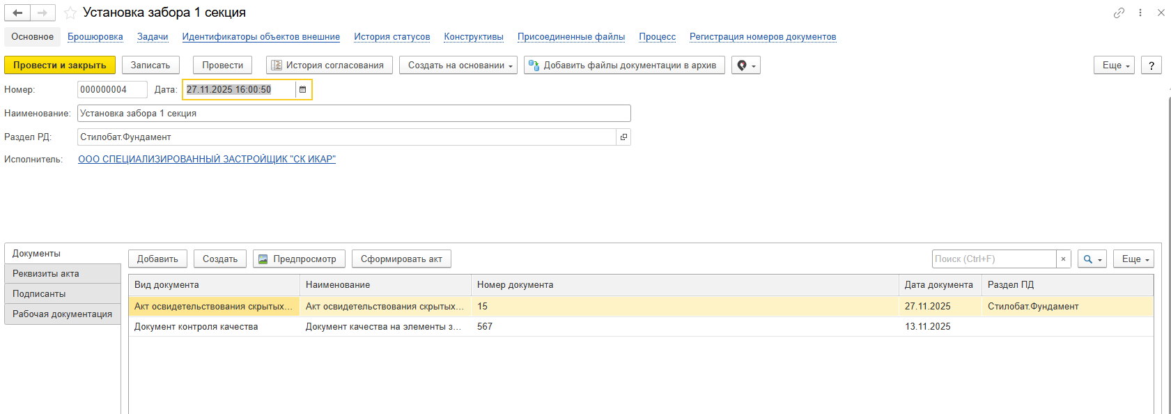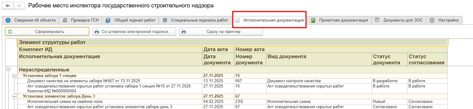 Вкладка «Исполнительная документация» содержит всю исполнительную документацию в виде реестра с указанием статуса документа.