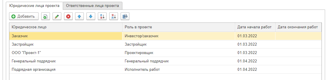 Чтобы назначить юридическое лицо на роль в проекте, в табличной части «Юридические лица» выберите его в выпадающем списке и укажите роль в проекте, а также дату начала работ.