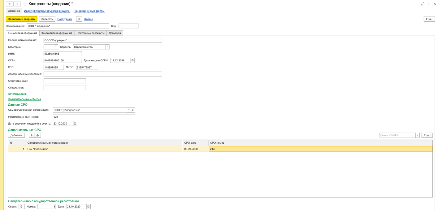 Если у организации одно СРО — достаточно заполнить реквизит в верхней части формы. Если СРО несколько, необходимо заполнить табличную часть внизу формы. Это позволит указать все саморегулируемые организации, в которых состоит контрагент, с отдельными номерами и датами регистрации.