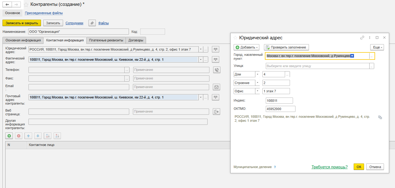 », тогда в окне создания контрагента данные будут заполнены сведениями копируемого юр. лица.