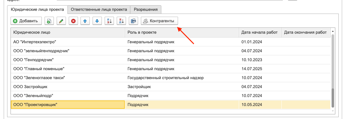 На вкладке «Юридические лица проекта» нужно нажать кнопку «Добавить», в табличной части добавится новая строка с выпадающим списком юридических лиц, внизу списка нужно нажать на кнопку «
