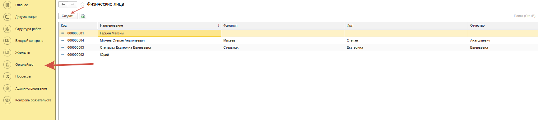 В меню «Органайзер» перейти в раздел «Физические лица» и нажать кнопку «Создать» (Рисунок 50).