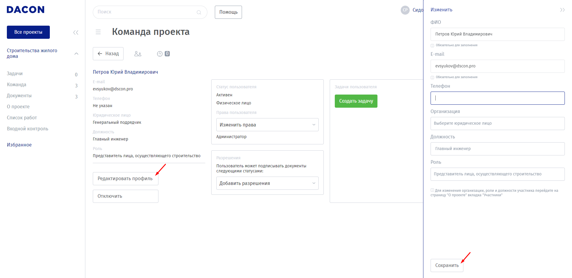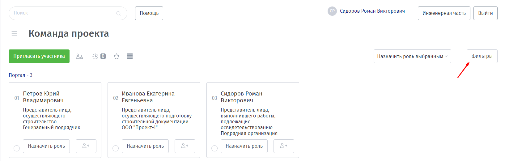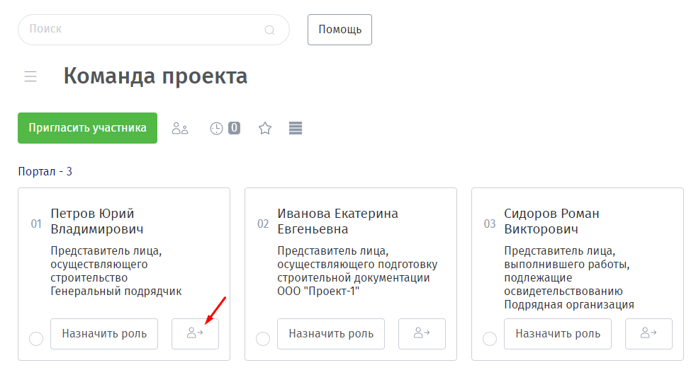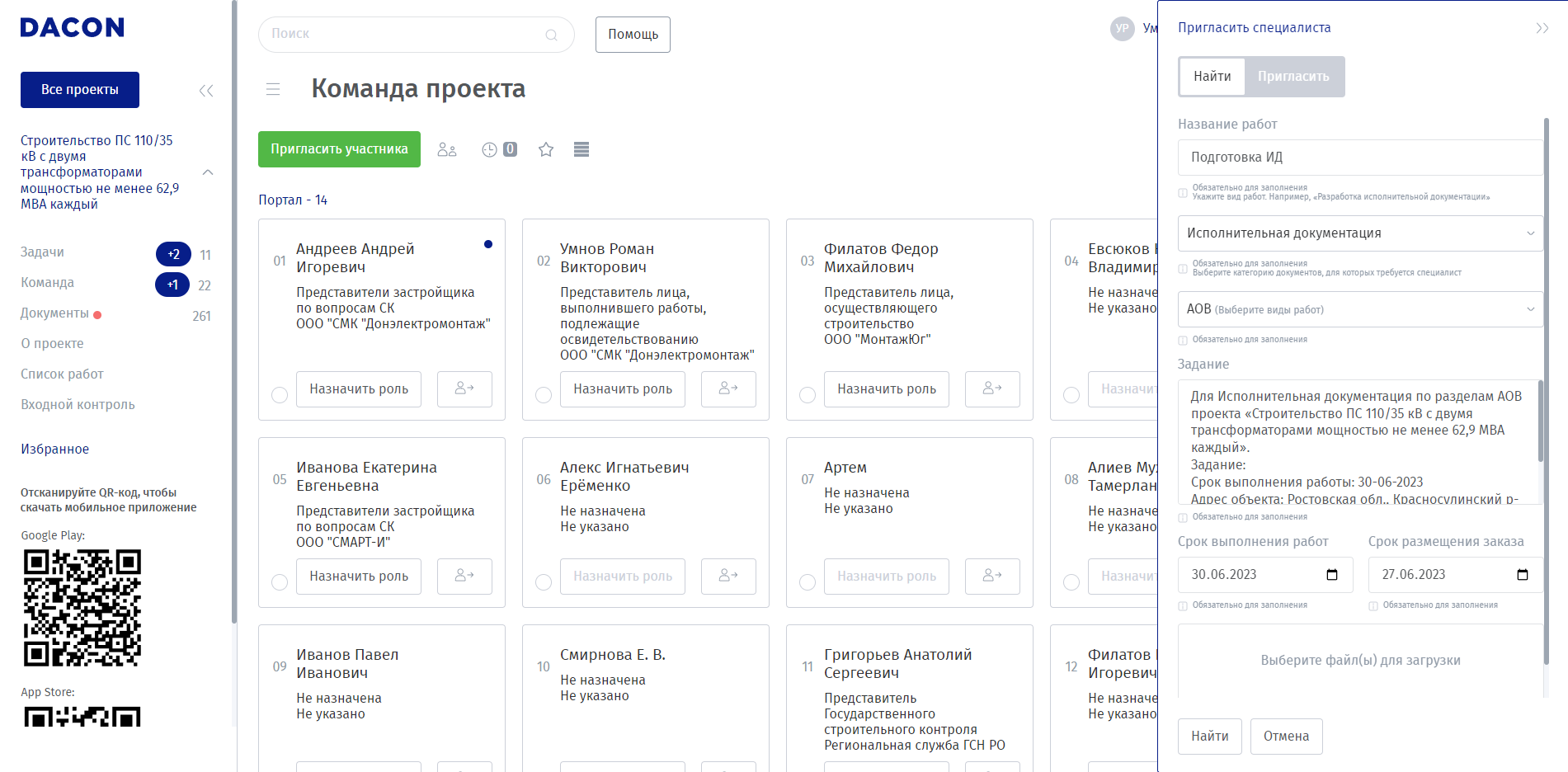 Управление пользователями проекта выполняется в разделе «Команда проекта», в системе доступные следующие действия с пользователями: приглашение и поиск новых специалистов, редактирование и отключение от проекта.