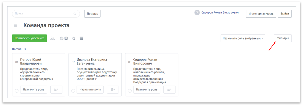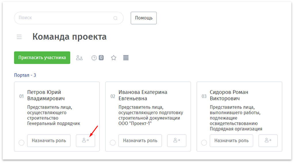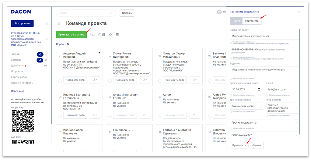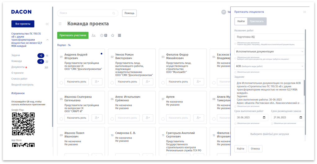 Управление пользователями проекта выполняется в разделе «Команда проекта», в системе доступные следующие действия с пользователями: приглашение и поиск новых специалистов, редактирование и отключение от проекта.