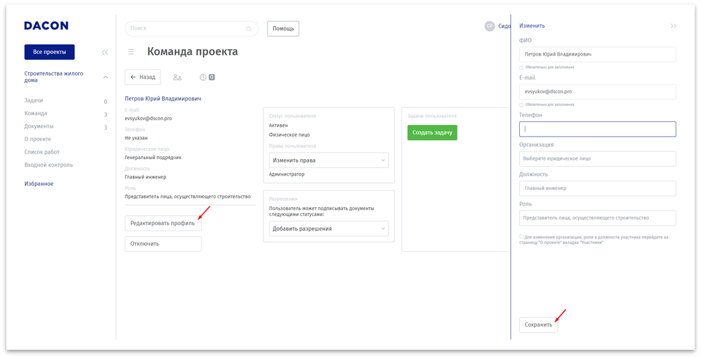 Редактирование пользователя перейдите на страницу пользователя, для этого нажмите на кнопку с человечком (Рисунок 4). В открывшемся окне нажмите кнопку «Редактировать профиль», в открывшейся шторке внесите необходимые изменения и нажмите кнопку «Сохранить» для применения (Рисунок 5). Также на этой странице можно управлять правами доступа, разрешенными статусами. В случае если кто-либо из участников завершил работу по проекту, его можно отключить от проекта нажатием кнопки «Отключить».