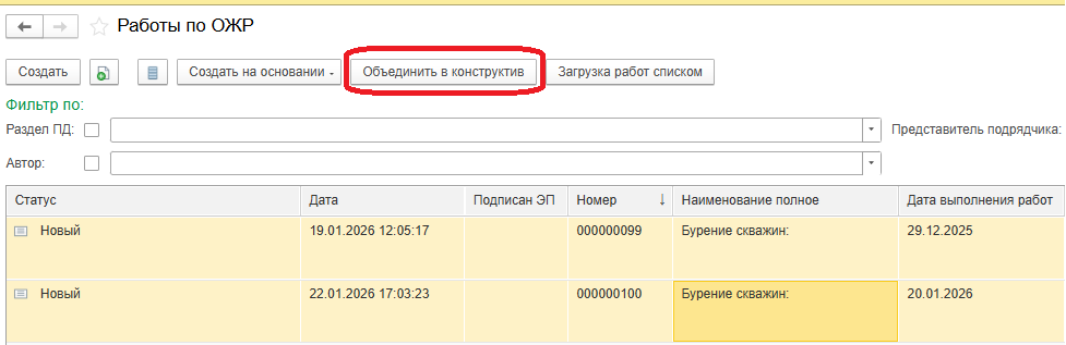 Создание конструктива. Конструктив оформляется на основании работ, зафиксированных в Общем журнале работ. Для этого необходимо выделить одну или несколько записей работ, которые должны попасть в конструктив и нажать кнопку «Объединить в конструктив» (Рисунок 98).