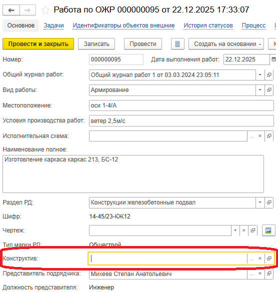 После выполнения работ соответствующие записи создаются в разделе «Работы по ОЖР», в этой записи есть возможность указать ранее созданный конструктив вручную (Рисунок 99). После привязки работы к конструктиву сведения о выполненных работах автоматически попадут в табличную часть конструктива.