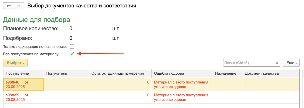 Примечание: при подборе поступлений или документов можно просмотреть информацию о возникших ошибках. Для этого необходимо нажать кнопку «Все поступления по материалу» (Рисунок 104) и в открывшемся списке выбрать нужное поступление. В столбце «Ошибка подбора» будет указана причина, по которой поступление не прошло по условиям соответствия.