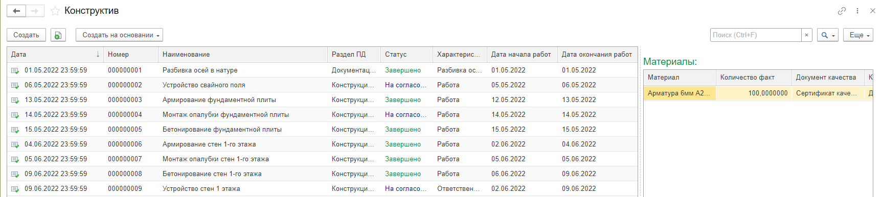 Посмотреть список уже созданных конструктивов, пользователь может через раздел «Структура работ» во вкладке «Конструктив». В этой же вкладке пользователь может создать новый конструктив (кнопка «Создать»), т.к. конструктив может быть создан не только на основании работ, зафиксированных в Общем журнале работ (ОЖР), но и заранее, до создания записей о выполненных работах или если Общий журнал работ не ведется. В этом случае пользователь заполняет основные сведения в конструктиве вручную.