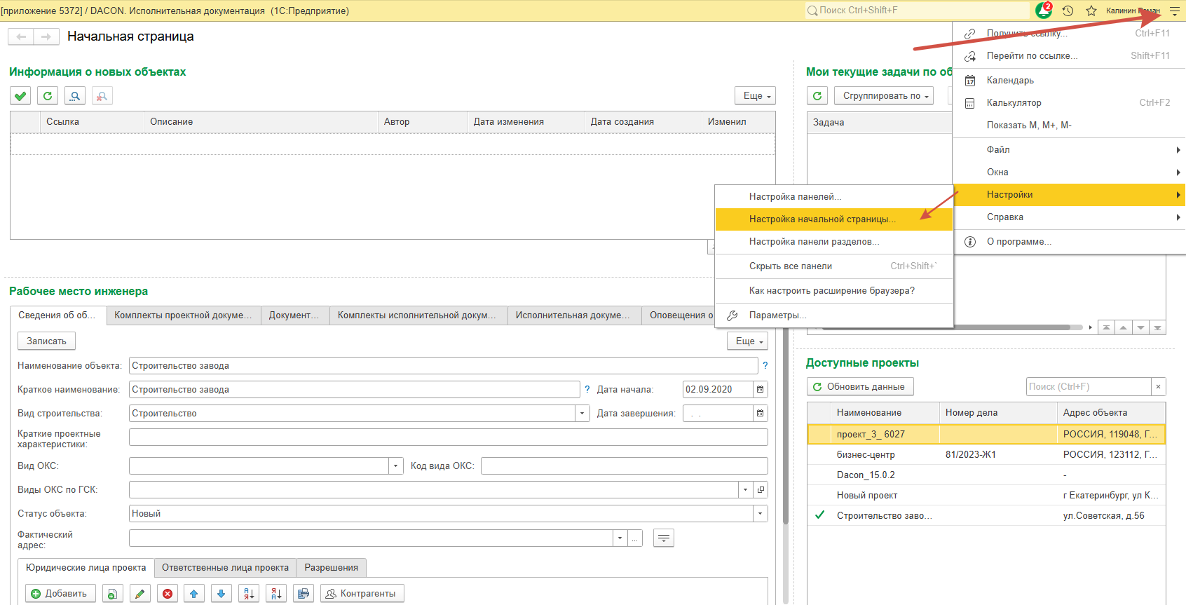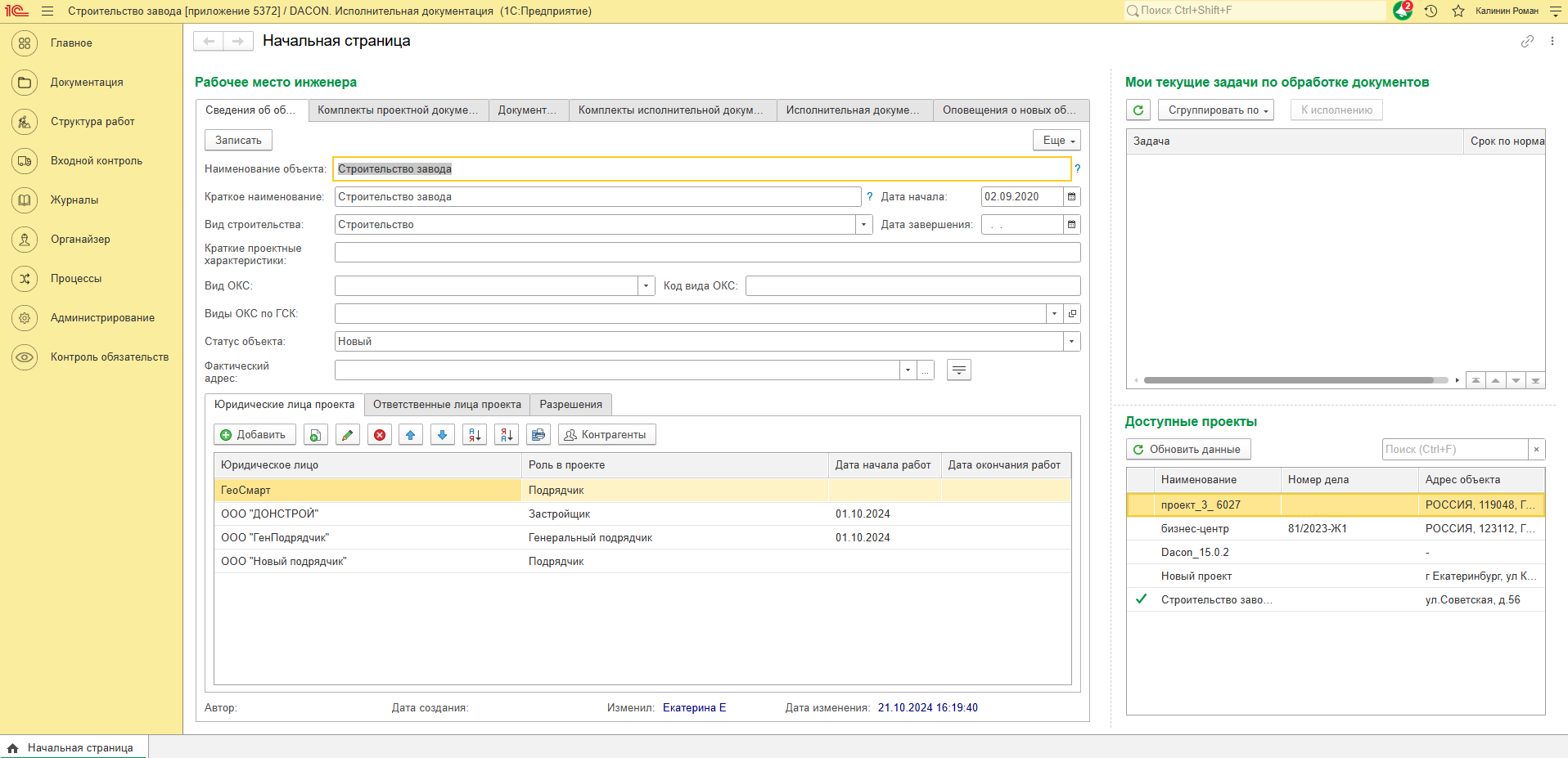 1.Рабочее место инженера — здесь отображаются основные сведения и документы строительного проекта;