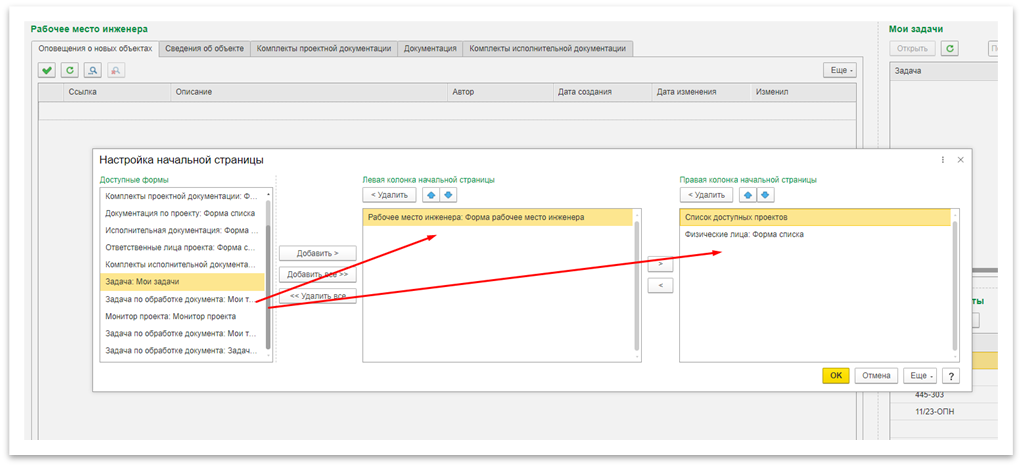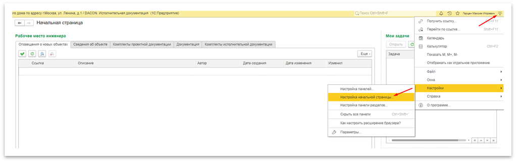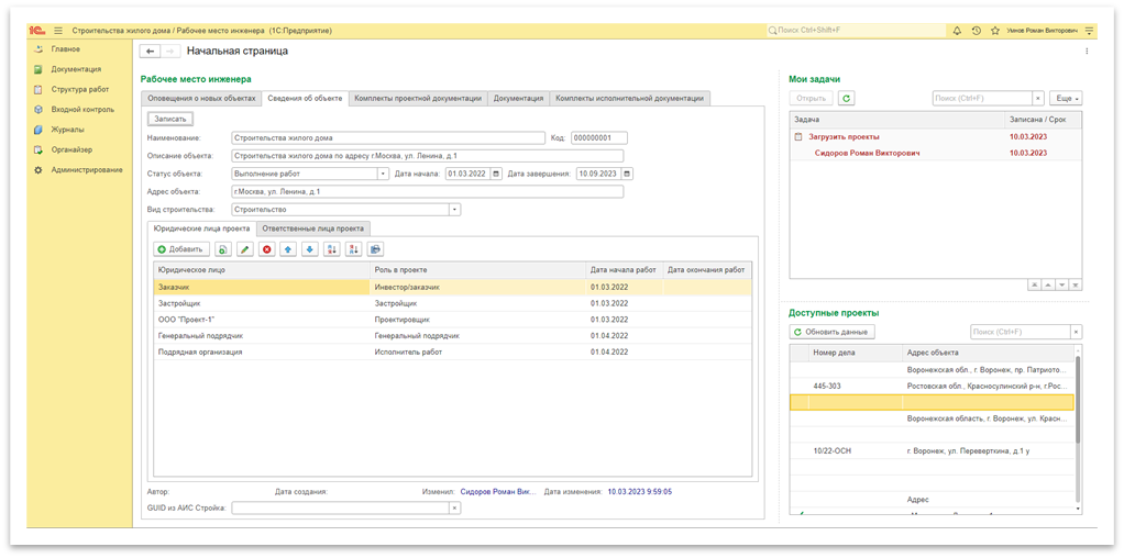 1. Рабочее место инженера — здесь отображаются основные сведения и документы строительного проекта;