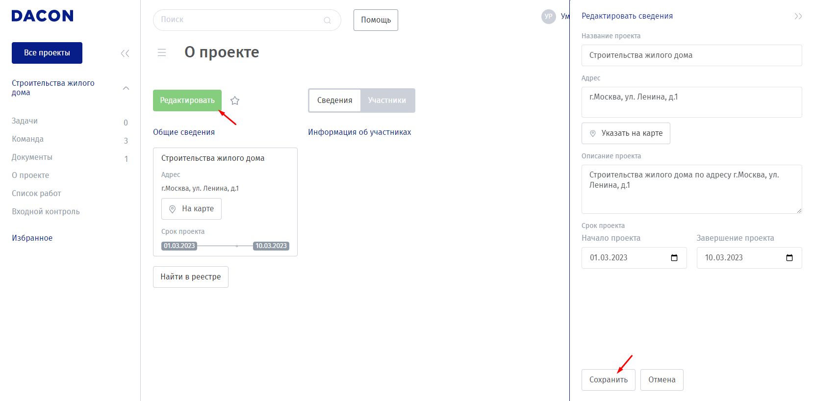 Редактирование общих сведений о проекте выполняется аналогичным образом.