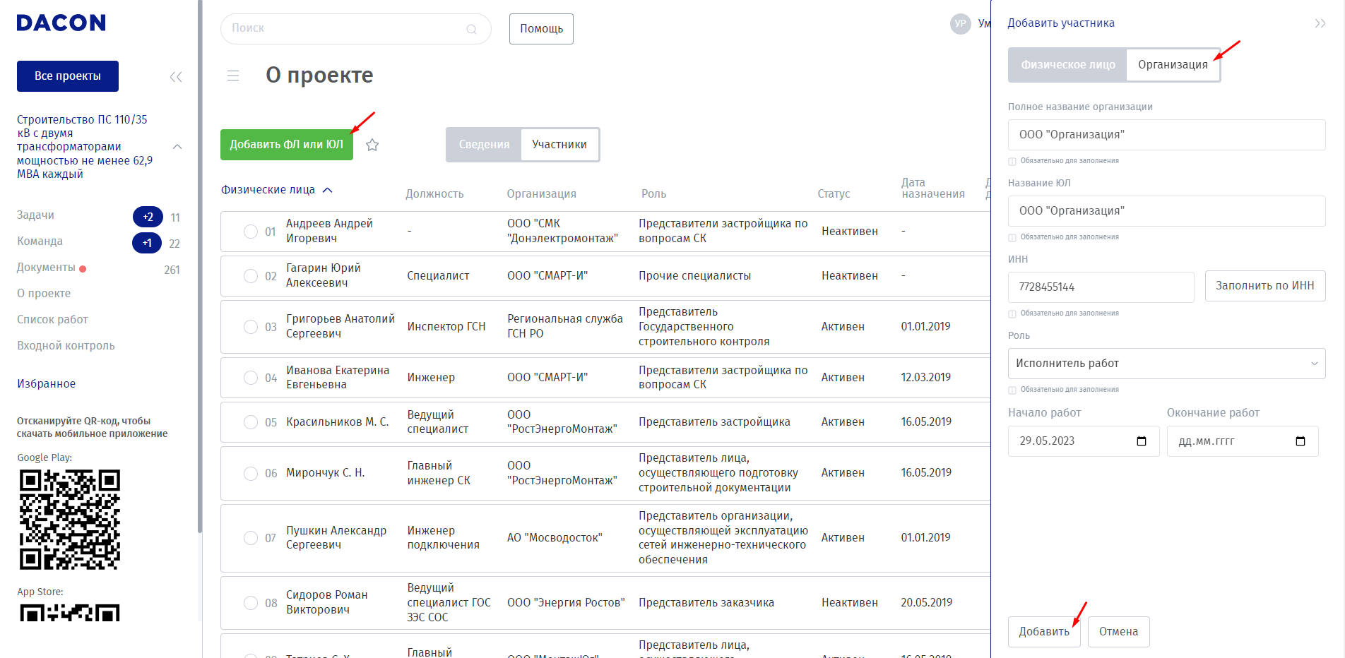 Добавление ответственных юридических лиц, участвующих в проекте. На вкладке «Участники» нужно нажать на кнопку «Добавить ФЛ или ЮЛ». В открывшейся шторке, на вкладке «Организация», заполняется полное название организации, название ЮЛ, ИНН, роль,  даты выполнения работ (если они известны), далее нажимается кнопка «Добавить» (Рисунок 6).