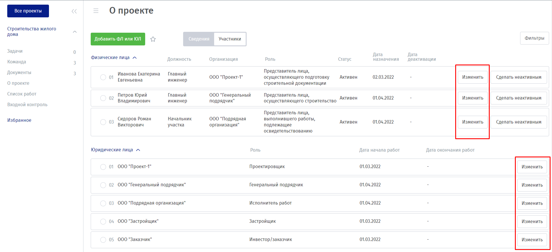 Изменение ответственных физических и юридических лиц. Для внесения изменений напротив соответствующих лиц нужно нажать кнопку «Изменить» (Рисунок 8), в открывшейся шторке внести необходимые изменения и нажать кнопку «Сохранить».