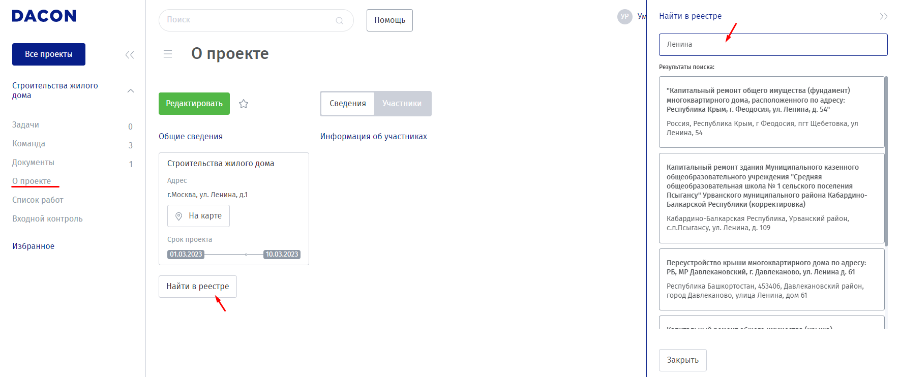 Способ 1. Загрузка сведений из реестра ЕГРЗ. «Найти в реестре» открывает «шторку», в которой вводится адрес или название объекта и выбирается нужный из списка (Рисунок 4), сведения о проекте и основные юр. лица заполняются автоматически.