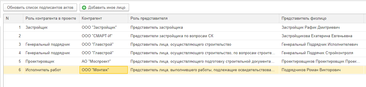 Если в качестве исполнителя указан контрагент с ролью Генеральный подрядчик, то на страницу подписанты выводятся строки без указания подрядчика.