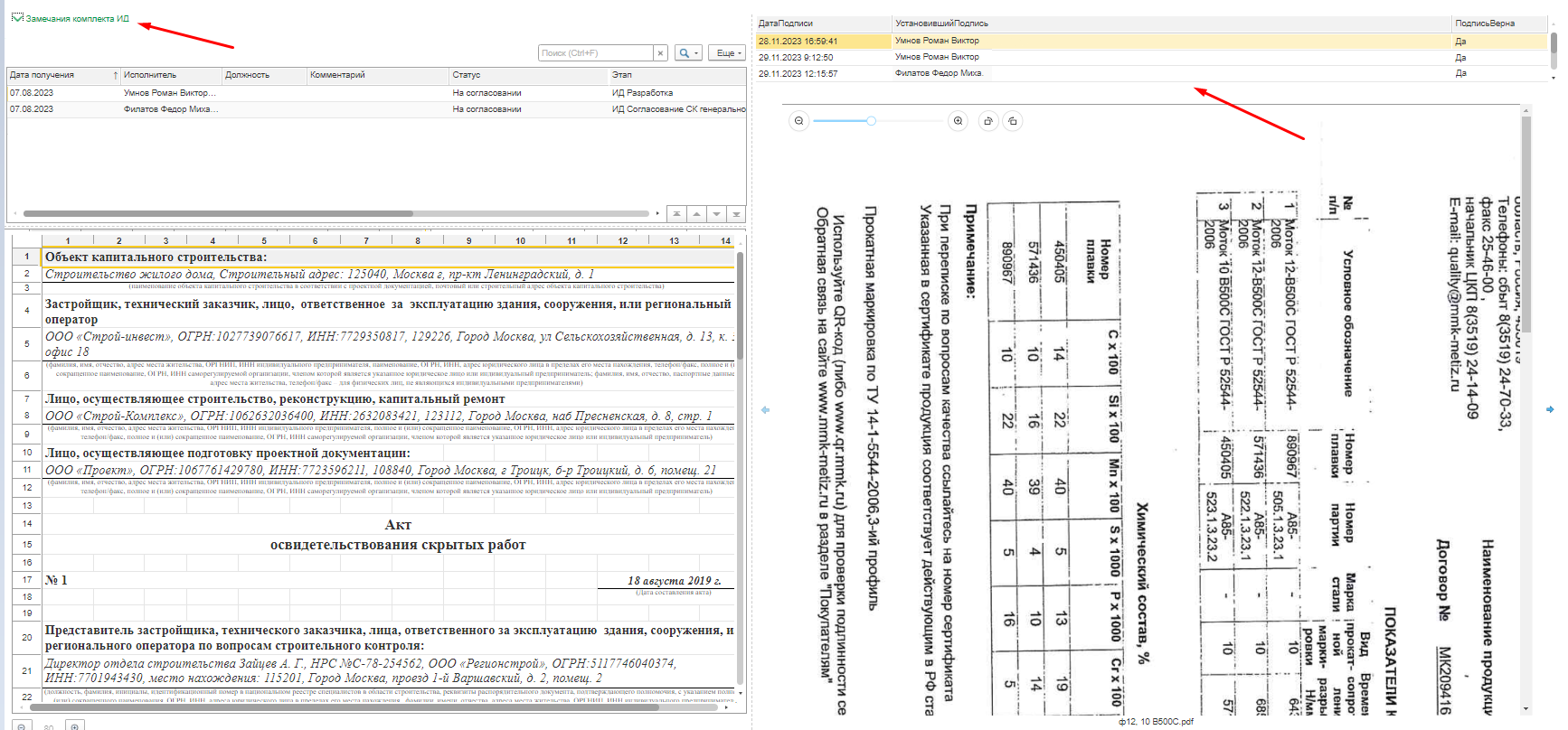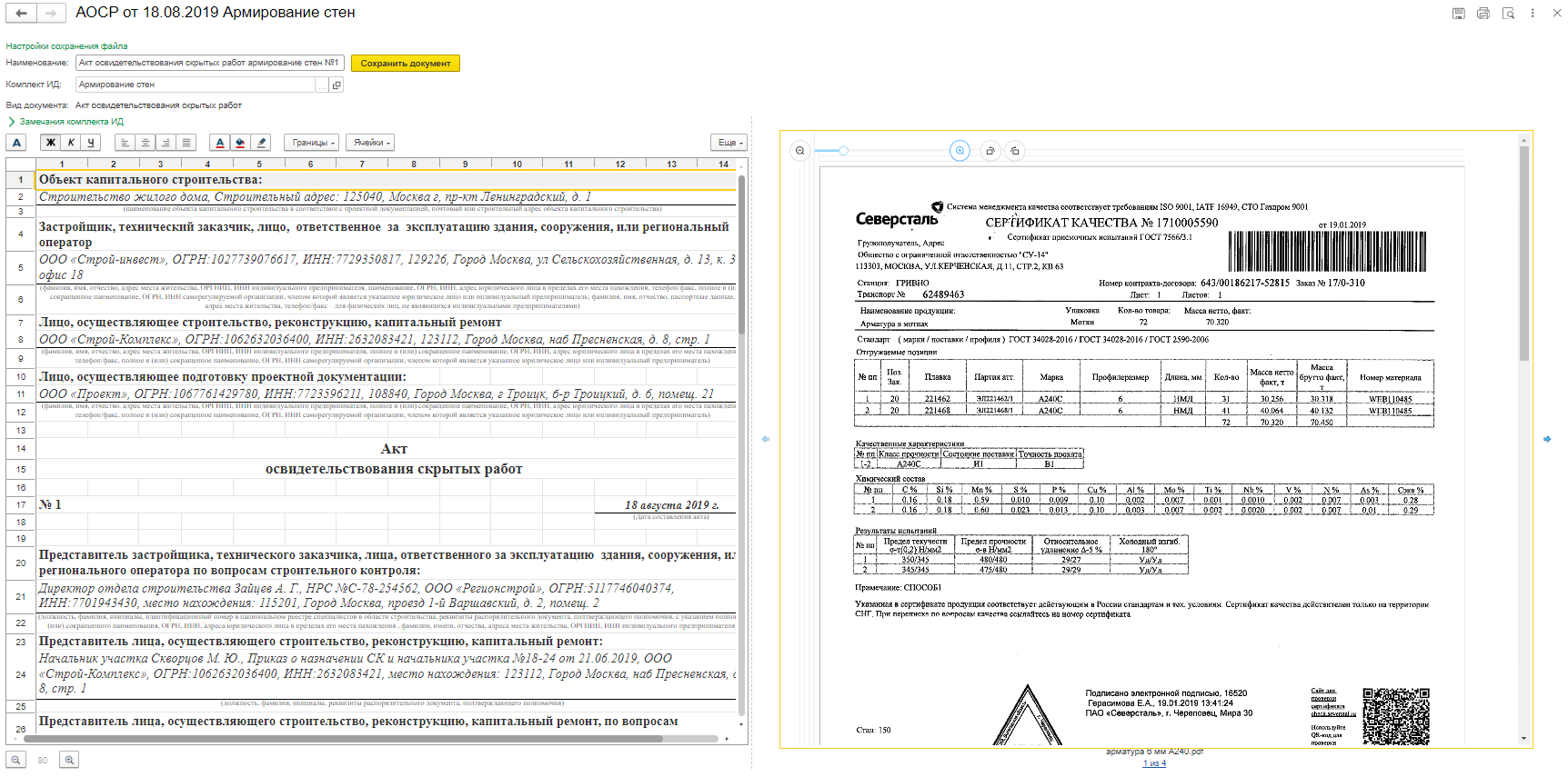Формирование Акта в Комплекте ИД. После того, как все данные в комплекте ИД заполнены, можно автоматически создать их, для этого нажмите на кнопку «Сформировать акт». В новом окне (Рисунок 144), в левой части экрана, сформируется документ для проверки указанных сведений, а в правой будут отображены все документы, которые приложены к акту. Если все данные заполнены корректно, можно сохранить акт в комплект исполнительной документации нажатием на кнопку «Сохранить документ»[1], для дальнейшего согласования, и на ПК в разных форматах нажатием на кнопку «