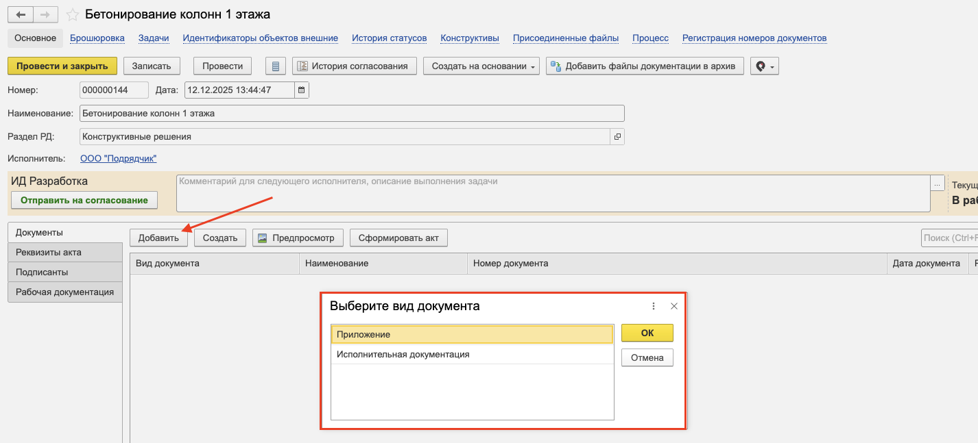 На вкладке «Документы» через кнопку «Добавить», «Исполнительная документация» добавляются к комплекту исполнительные схемы, акты испытаний и другие виды актов.