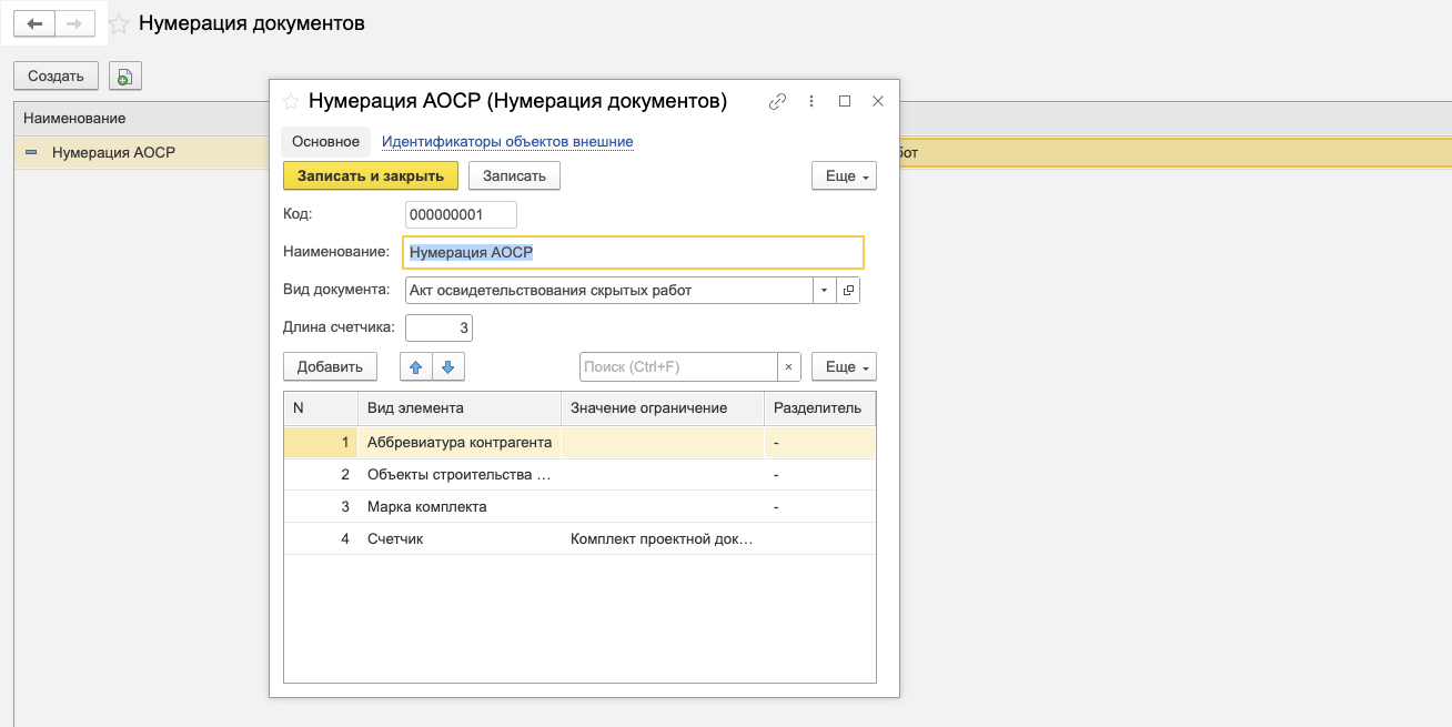 В качестве примера приведем настройку элемента «Нумерация АОСР» справочника «Нумерация документов», используемая для формирования номеров актов освидетельствования скрытых работ (Рисунок 136).