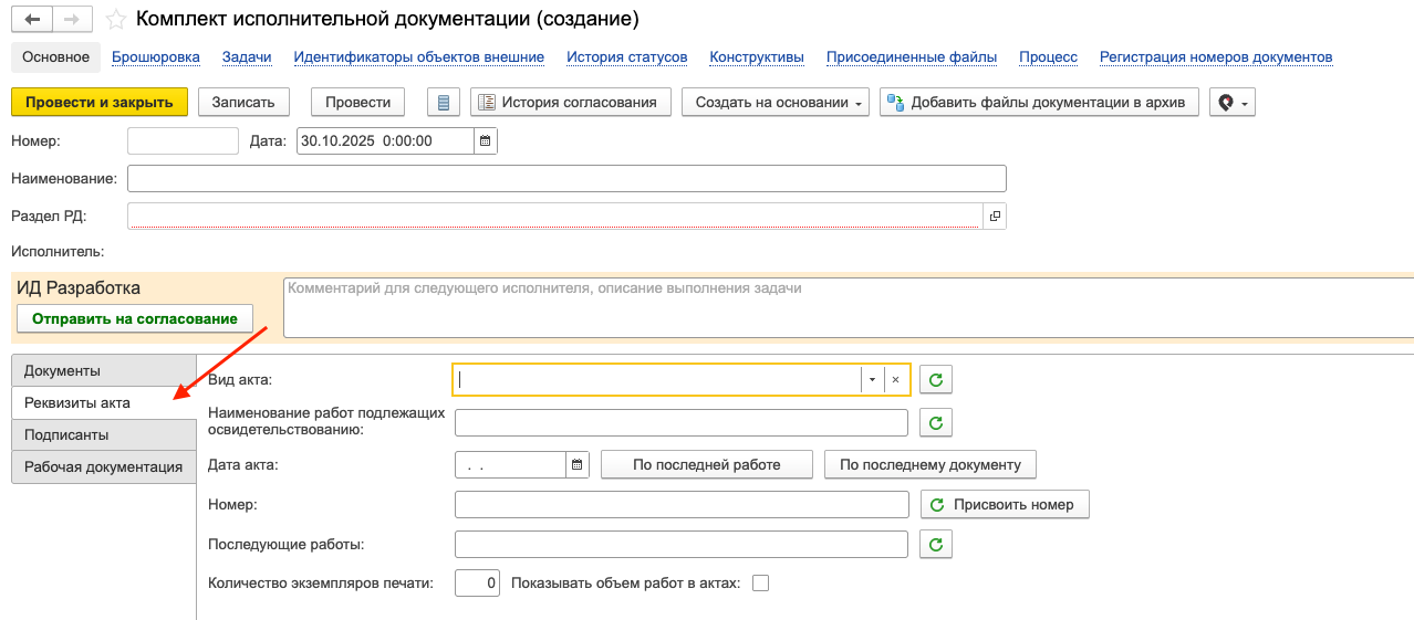 После открытия страницы создания комплекта исполнительной документации происходит автоматическая привязка комплекта к Конструктиву. Далее необходимо перейти на вкладку «Реквизиты акта» (Рисунок 135) и указать реквизиты для заполнения акта освидетельствования работ. Для удобства заполнения предусмотрена возможность выбрать дату акта по самой поздней дате документа, входящего в состав комплекта.