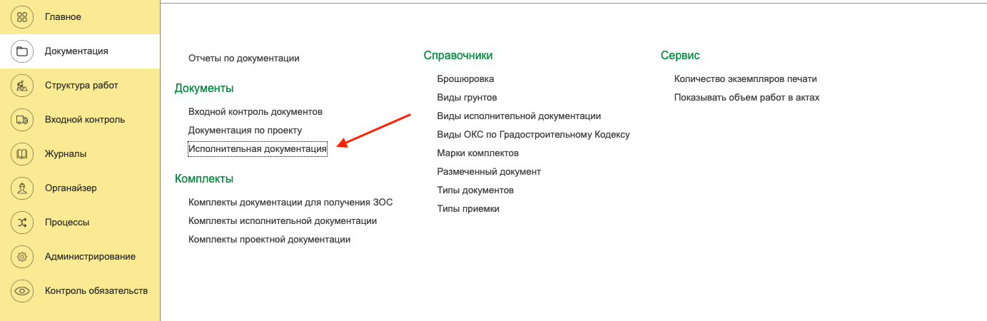 Созданные акты из комплекта исполнительной документации хранятся в разделе «Исполнительная документация». Там же находятся исполнительные схемы, акты испытаний и другие виды актов.