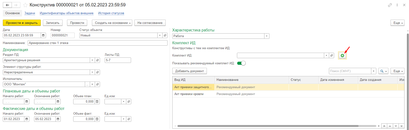 Создание комплекта исполнительной документации. Открыть Конструктив, для которого требуется подготовить исполнительную документацию. В правой части формы Конструктива, в подразделе «Комплект ИД», нажать кнопку «