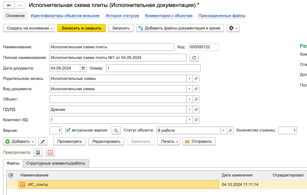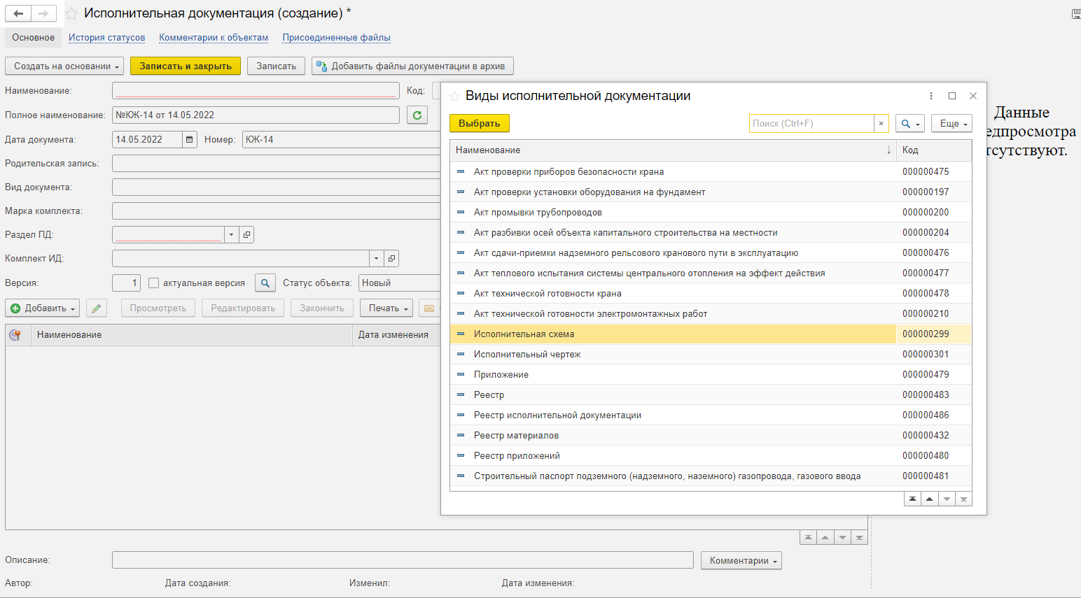 При выборе Вида документа = «Исполнительная схема» реквизит «Наименование» заполняется текстом «Исполнительная схема» дополнительно нужно указать название самой схемы, если оно есть.