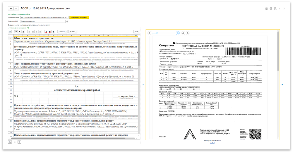 Формирование документа освидетельствования работ. После того, как все данные в комплекте ИД заполнены, можно автоматически создать акты освидетельствования, для этого нажмите на кнопку «Распечатать акт». В новом окне (Рисунок 9), в левой части экрана, сформируется документ для проверки указанных сведений, а в правой будут отображены все документы, которые приложены к акту. Если все данные заполнены корректно, можно сохранить акт в комплект исполнительной документации нажатием на кнопку «Сохранить документ», для дальнейшего согласования, и на ПК в разных форматах нажатием на кнопку «