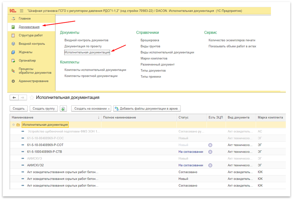 Просмотр списка комплектов исполнительной документации. Чтобы просматривать и работать с комплектами исполнительной документации, необходимо в меню «Документация» перейти в раздел «Комплекты исполнительной документации». На этой странице пользователь может просматривать и редактировать уже созданные комплекты (редактирование недоступно, если комплект находится в статусе «Согласован», сначала его нужно перевести в статус «На доработке»), ставить задачи на основании какого-либо из комплектов и скачать все документы, входящие в комплект одним архивом.