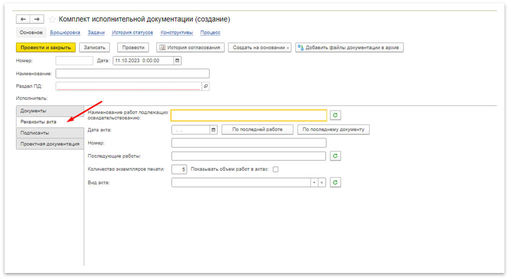 После того, как откроется страница создания комплекта, нажмите «Провести и закрыть» для привязки Комплекта исполнительной документации к Конструктиву. Затем снова откройте комплект исполнительной документации и перейдите на вкладку «Реквизиты акта» (Рисунок 3) и укажите реквизиты для заполнения акта освидетельствования работ. Для удобства заполнения есть возможность выбора даты акта по самой поздней дате документа, входящего в состав комплекта. Чтобы подтянуть данные из конструктива, можете нажать на кнопку «