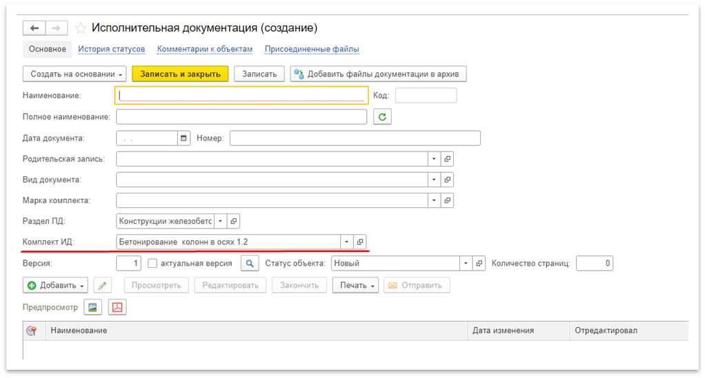 Если до этого был создан «Комплект ИД», возможно указать его в соответствующем окне. Затем добавьте файл через кнопку «Добавить». Когда все поля будут заполнены, нажмите кнопку «Записать и закрыть».