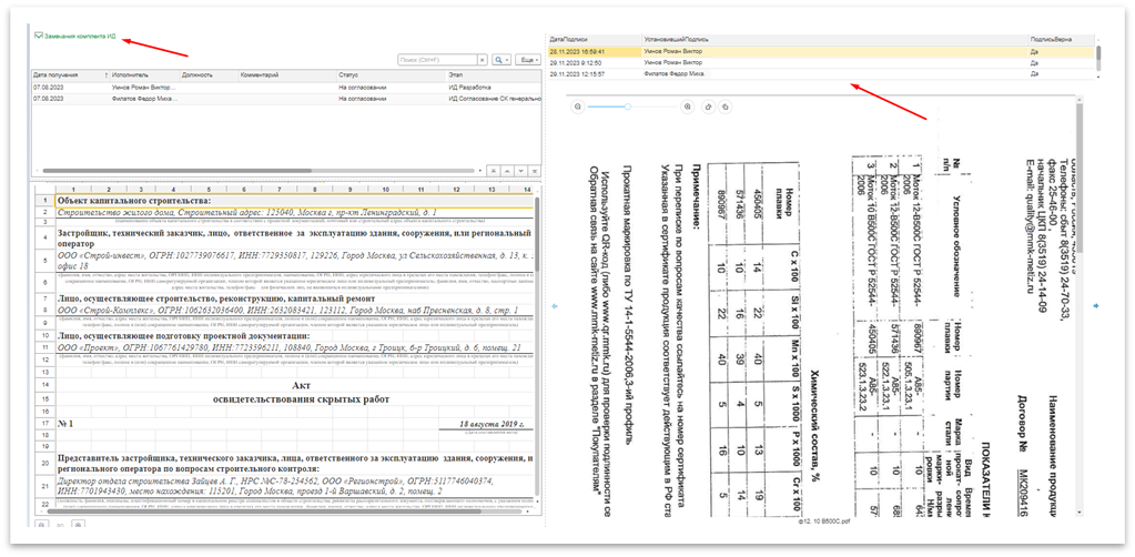 На вкладках «Документы» и «Проектная документация» автоматически добавятся документы качества выбранных материалов, приложения и комплект проектной/рабочей документации для удобства сравнения с данными выполненных работ из конструктива.